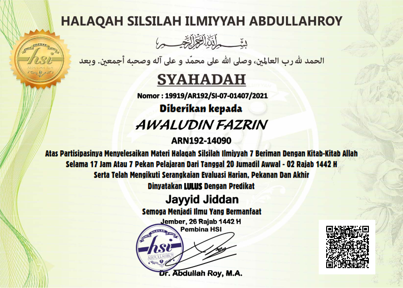 Dibimbing oleh Ustadz Abdullah Roy Hafidzahullah. Lihat Sertifikat